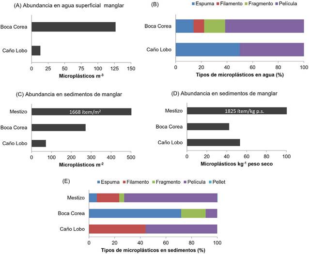 Microplásticos en agua y sedimentos de manglares. En el agua superficial del manglar de Boca de Corea se determinó una abundancia de 123 microplásticos m-3 y en Caño Lobo de 13 microplásticos m-3 (Fig. 2A). La estación Boca de Corea se ubicó en un área de alta influencia del río Sinú, el cual es receptor de parte de los residuos domésticos generados por las poblaciones asentadas en sus riberas y, por tanto, es una fuente de basuras para la zona costera (Bayona-Arenas & Garcés-Ordóñez, 2018). Las películas fueron el tipo de microplásticos más abundantes en el agua, seguida de las espumas de poliestireno expandido (Fig. 2B).