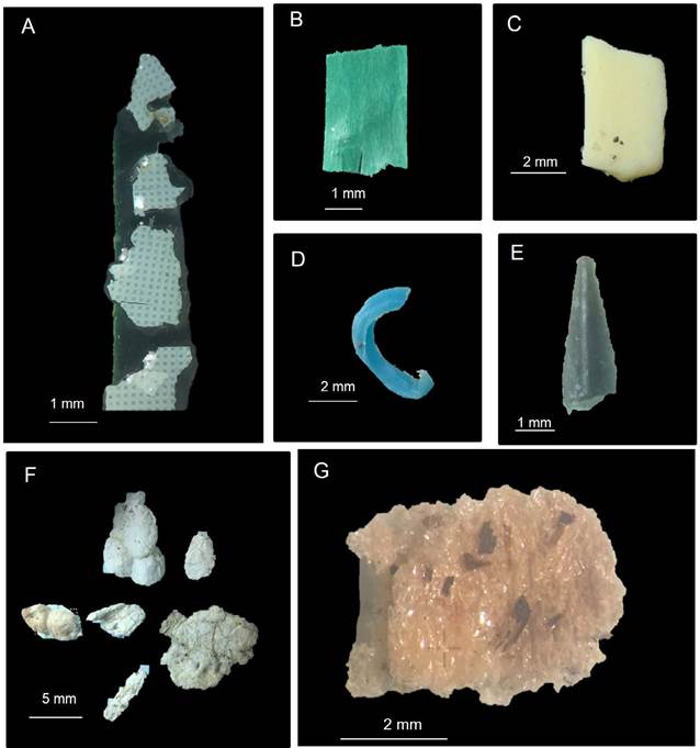 Los microplásticos tipo películas son usualmente fracciones de bolsas; las espumas de poliestireno expandido provienen de la desintegración de utensilios desechables para servir alimentos, boyas y neveras usados comúnmente en la actividad pesquera; los filamentos probablemente provienen de cuerdas y redes de pesca y agua residual, y los fragmentos provienen de piezas de plásticos duro (Li et al. 2016; Wang et al. 2016).