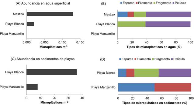 de Mestizo se registró la mayor cantidad 0.13 microplásticos m-3. Las películas y los fragmentos fueron los más comunes en el agua superficial de las playas (Fig. 4B). En la arena se determinaron de 8 a 36 microplásticos m-2, la playa Blanca fue la más contaminada (Fig. 4C); las películas y los fragmentos dominaron en playa Blanca y los filamentos y espumas en playa Manzanillo (Fig. 4D).