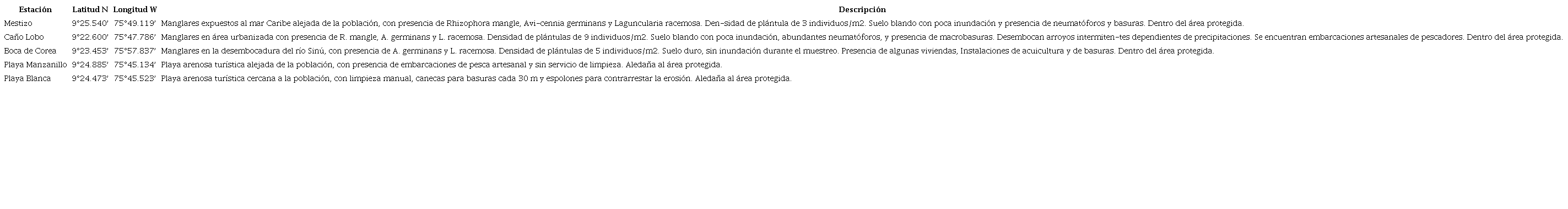Estaciones de muestreo. Se seleccionaron cinco estaciones de muestreo, de las cuales tres se situaron en las zonas de manglar (Mestizo, Boca de Corea y Caño Lobo) y dos en las playas turísticas (Blanca y Manzanillo) del área de estudio (Fig. 1). Las características de estas estaciones se describen en el cuadro 1.