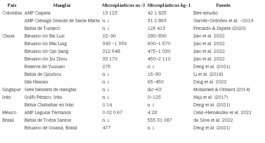 Las abundancias de microplásticos en sedimentos de los manglares de Cispata fueron mayores a las reportadas para Singapur (Mohamed & Obbard, 2014), Irán (Naji et al. 2017), Colombia (bahía de Tumaco; Preciado & Zapata, 2020) y China (bahía de Qinzhou; Li et al. 2018); menores a los de China (río Jiu Zhou; Jiao et al. 2022) y Brasil (bahía de Todos los Santos; da Silva et al. 2022) y similares al de Ciénaga Grande de Santa Marta, Colombia (Garcés-Ordóñez et al. 2019; Cuadro 2).