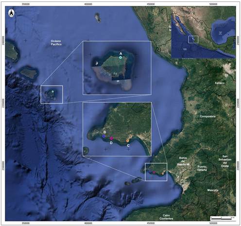 Tres de los sitios estudiados se localizan dentro de la bahía de Banderas: playa La Manzanilla (20° 44’ 33.9” N 105° 23’ 14.8” O), playa La Lancha (20° 45’ 36.0” N 105° 29’ 20” O), playa Burros (20° 45ʼ 07.7” N 105° 27ʼ 22.3ʼʼ O), y uno en isla María Cleofas (21° 19’ 53.8” N 106° 14’ 16.4” O) (Fig. 1).