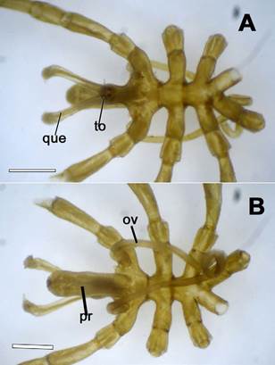 Observaciones: la especie fue abundante en los muelles de la marina, como todos los organismos de Phoxichilidiidae no tienen pedipalpos y presentan un cuerpo rugoso. Se distingue por un reborde en la parte ventral del tronco, solo presente en especímenes sin apéndices ovígeros por lo que pudiera ser una estructura asociada con el dimorfismo sexual; tiene glándulas de seda diferenciadas en el tercer par de patas, una probóscide que no excede el tamaño de los quelíceros (Fig. 2AB). Quelíforos quelados, ausencia o reducción de los palpos, ovígeros con ocho segmentos en los machos y ausencia de ovígeros en hembras.