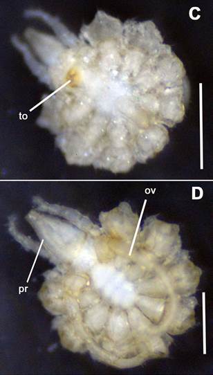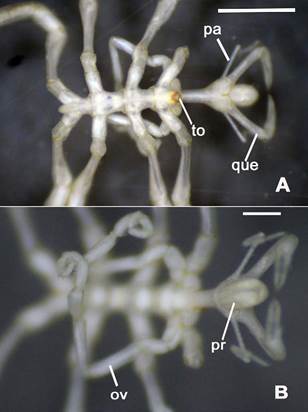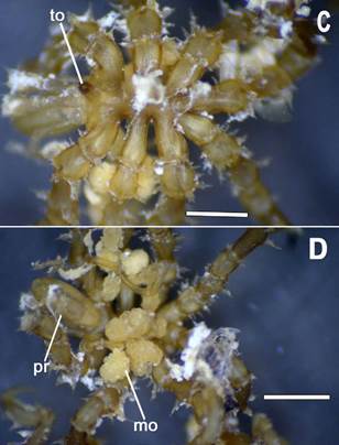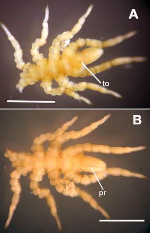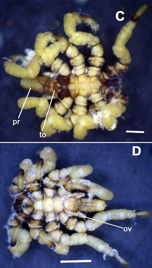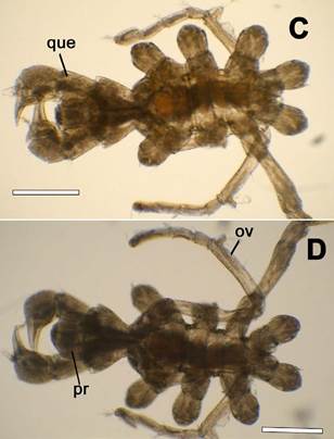 Observaciones: la ausencia de apéndices locomotores impidió la identificación de la especie. Los quelíceros están ausentes o son vestigiales. Palpos de 4 a 7 segmentos. Cuerpo o tronco completamente redondo o discoidal (Fig. 5C-D). Tanystylum sp. presenta diferencias morfológicas con