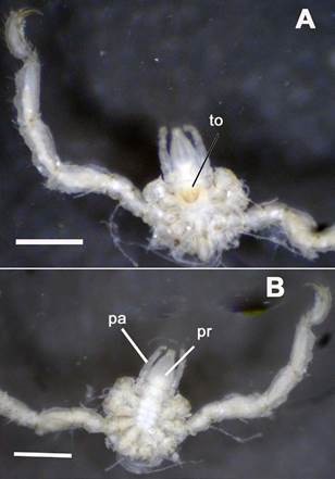 Observaciones: la especie se caracteriza por su tronco robusto (Fig. 4A-B), sin tubérculos en el cuerpo, tubérculo ocular poco diferenciado, con dos ojos adelante y dos atrás, patas solo con una uña, no presenta uñas auxiliares, algunas espinas en el propodio. Se alimenta de actinias (Dietz et al. 2018).