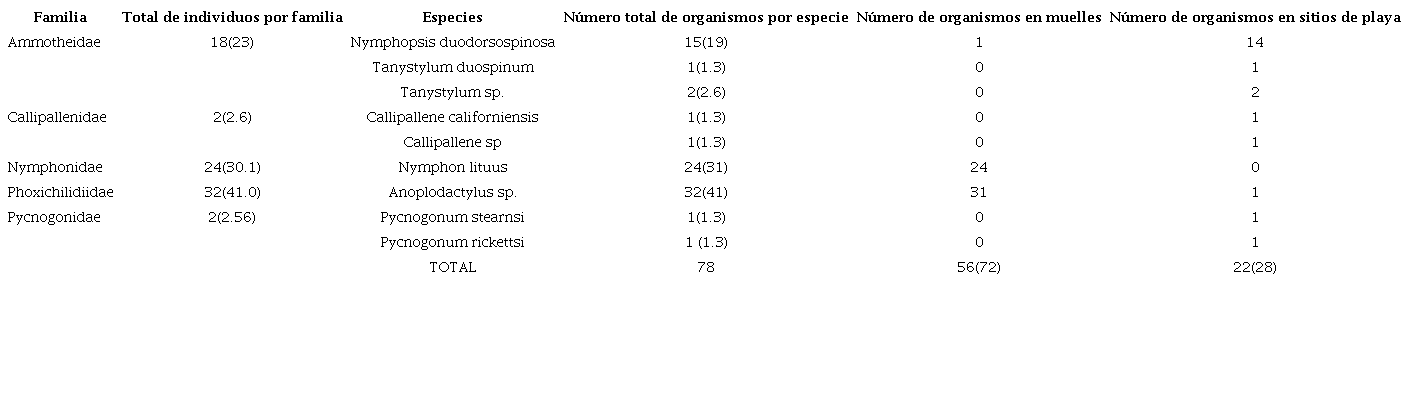 Se examinó un total de 78 especímenes de picnogónidos, 34 machos y 43 hembras; corresponden a cinco familias, seis géneros y nueve especies (Cuadro 1). En los muelles estuvieron