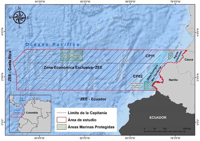 entre las coordenadas geográficas 3° 13ʼ 0ʼʼ N a 1° 25ʼ 0ʼʼ N y 85° 10ʼ 3ʼʼ W a 77° 28ʼ 24ʼʼ W. El área de estudio abarca territorios de los diez municipios costeros pertenecientes a los departamentos de Nariño y Cauca en el sur del Pacífico colombiano, los cuales se caracterizan por una amplia riqueza cultural, recursos naturales y una economía representada, principalmente, por actividades de pesca, agropecuarias y turísticas (Perea-Ardila et al. 2023).
