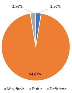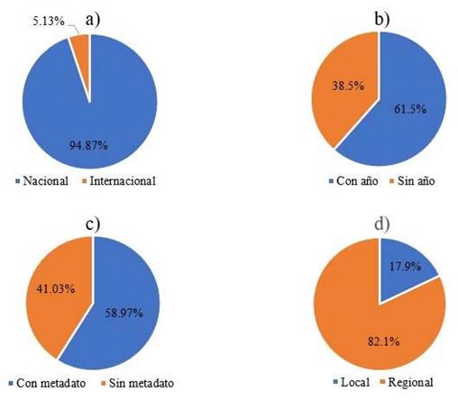En la Figura 2, se muestran los resultados generales obtenidos para los 39 DG analizados, en lo referente al examen y a la presencia o ausencia de información complementaria de calidad (entidad creadora, año, metadato y escala). En el Cuadro 4, se presentó el análisis de calidad logrado bajo el enfoque MSPglobal para los 39 DG estudiados, con la ponderación de los criterios y la clasificación de la calidad. Asimismo, la Figura 3 dejó ver el porcentaje categórico de la calidad para los 39 DG valorados, según el enfoque MSPglobal.