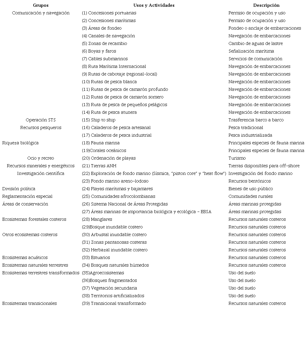 Datos. Los DG utilizados en este estudio correspondieron a 39 DG multiescalares con información de usos/actividades en el espacio marino-costero, que fueron estructurados en una geodatabase para una propuesta de PEM presentada por Perea-Ardila et al. (2023) (Cuadro 1). Los DG de Perea-Ardila et al. (2023) se obtuvieron de distintas fuentes oficiales de libre acceso. Los DG albergados en la geodatabase venían organizados en grupos, que se clasificaban según la vocación de uso e incluían su descripción general.