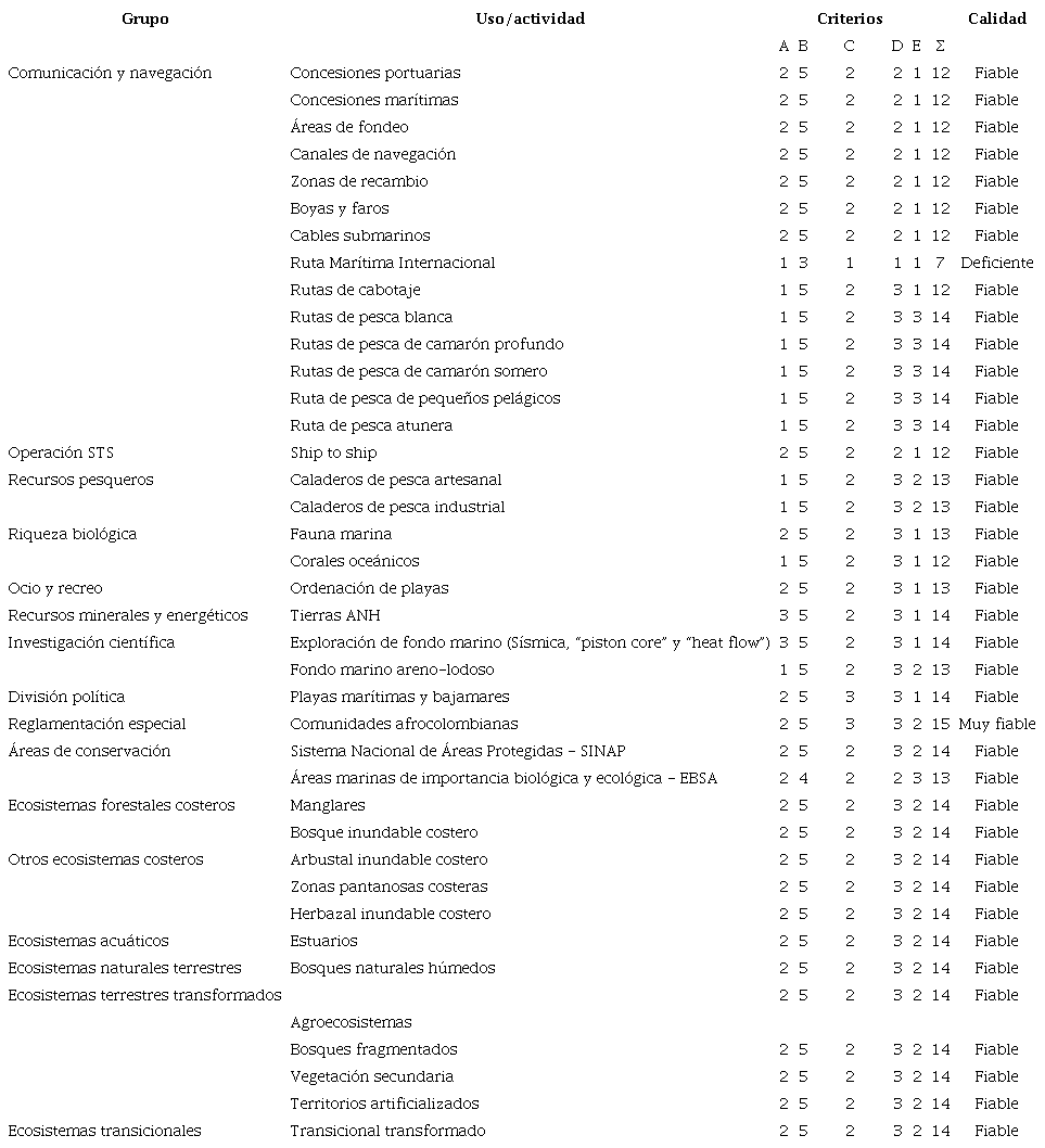 Para complementar el enfoque MSPglobal, se adicionaron otros criterios de calidad, en este caso, se observó la localización de los usos/actividades en el espacio marino-costero, los ubicados en aguas interiores-zonas costeras se clasificaron en escala local y aquellos localizados en los espacios marítimos (mar territorial, zona contigua y zona económica exclusiva) se categorizaron en escala regional; entidad creadora y su año de creación.