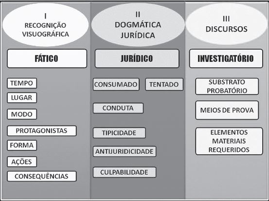 Certamente, a construção de estratégias para enfrentar a violência de gênero depende da produção de mais investigações que permitam a produção de diagnósticos mais precisos ( SEGATO, 2010, p. 134). Como forma de superar o déficit investigatório, o Núcleo de Estudo e Pesquisa em Violência de Gênero da SSP/PI elaborou Metodologia Investigatória do Feminicídio, tomando como eixos as Diretrizes Nacionais Feminicídio, a metodologia investigatória do homicídio elaborada pelo Núcleo de Inteligência da SSP/PI, o conteúdo de inquéritos policiais que apuraram feminicídio, o Protocolo de Bogotá e os dados dos sistemas operacionais da Polícia SISBO, SISPROCEP e SIMCVLI. O modelo foi construído a partir de três componentes: fático, jurídico e probatório. Deles resultaram variados protocolos, entre os quais se destaca a Recognição Visuográfica na Perspectiva de Gênero, Dogmática jurídica e Discursos oficiais. A figura 1 ilustra os três componentes da metodologia.