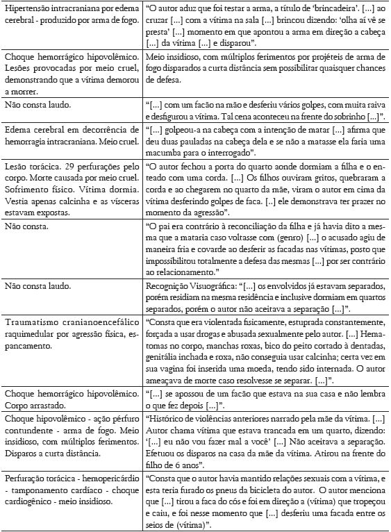A partir da análise documental dos procedimentos selecionados nesta pesquisa, podem ser avançadas considerações sobre a prova pericial. Alguns dos laudos periciais que instruem os procedimentos explicitam ações de domínio e apropriação do corpo feminino pela força ( SEGATO, 2010, p. 21) - vítima se protege dos golpes; relação de verticalidade - agressor em plano superior à vítima e expressividade da violência - golpes sucessivos e profundos, mesmo depois do estado de inércia da vítima ( SEGATO, 2010, p. 44, grifo nosso):