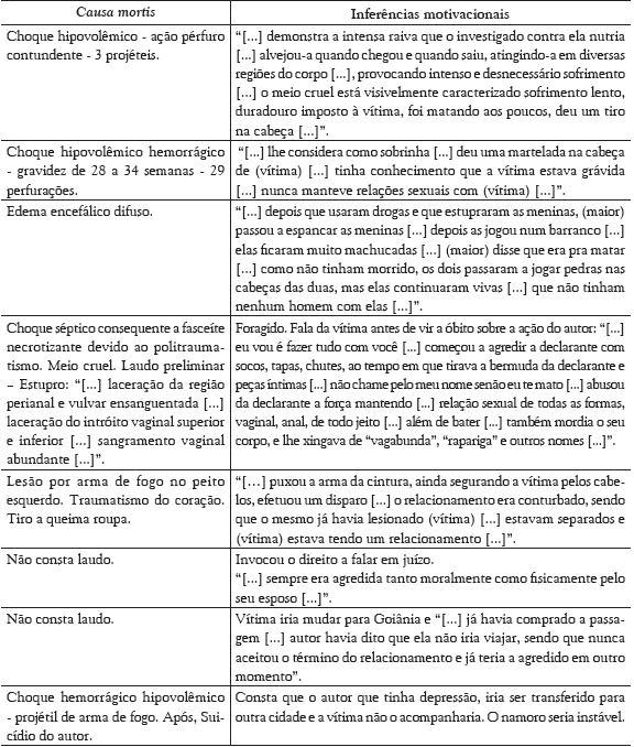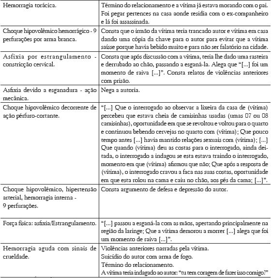 Embora sejam identificadas nos laudos depoimentos, declarações e interrogatórios, nota-se que o sistema Polícia Civil observa a prática do feminicídio conforme programas padronizados e rotinas cognitivas estabilizadas para a investigação dos crimes contra a pessoa, de forma generalizada.