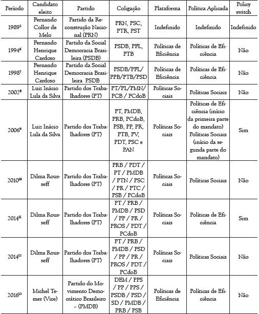 No contexto político brasileiro, especialmente no período pós-democratização, as dinâmicas de policy switch, em que as plataformas de campanha do candidato à eleição acabam por sofrer modificações anteriormente desconhecidas pelos eleitores quando o candidato ascende a incumbente, não são tão comuns, mas não deixam de ser adotadas no âmbito federal, conforme se depreende da ilustração a seguir, em que há exemplos de troca da plataforma evidenciada no período de campanha4 e seu resultado após a vitória do candidato eleito.