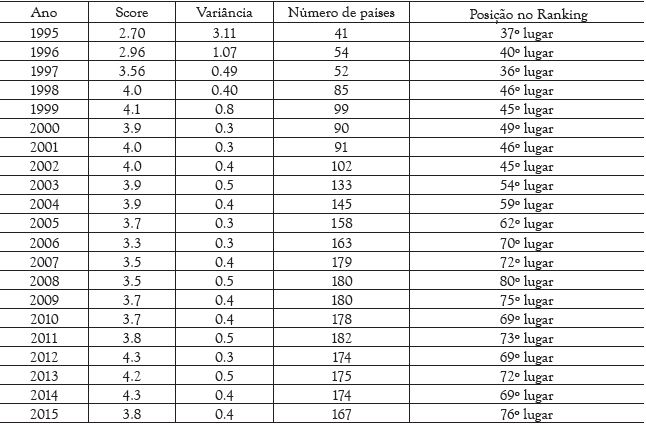 Para ilustrar o nível de percepção dos cidadãos brasileiros sobre a corrupção política, colaciona-se a seguir uma tabela com dados obtidos por meio da compilação de informações de index anuais (Corruption Perceptions Index – CPI) 15 da organização não governamental Transparência Internacional, para verificar o desempenho do Brasil no período compreendido entre 1995 (data de início da elaboração dos index) até 2015, identificando o ranking de percepção de corrupção entre os países examinados.
