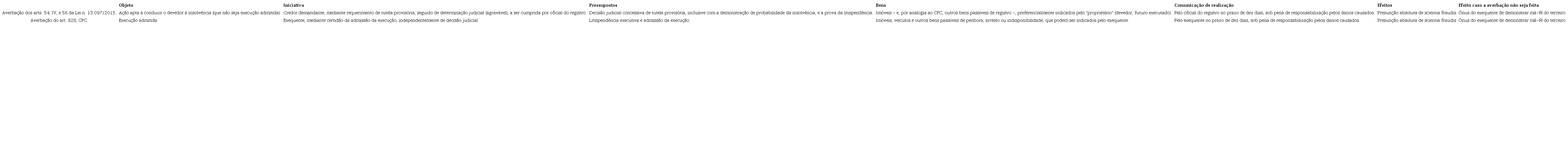 Segue, por fim, um quadro comparativo do regramento da forma de averbação prevista no art. 56 da Lei n. 13.097/2015 (para ações aptas a conduzir o devedor à insolvência), e no art. 828 do CPC-2015 (para execuções admitidas).