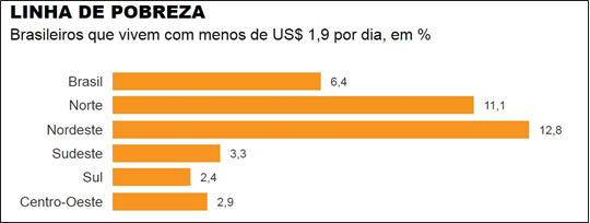Atualizando dados, citam-se exemplos de notações oferecidas pelo Instituto Brasileiro de Geografia e Estatística (IBGE), que, em 2016, divulgou uma pesquisa sobre a pobreza mais extrema, resumida no gráfico abaixo.