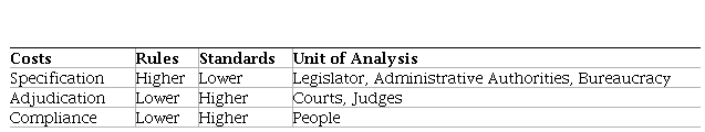 Finally, compliance costs represent costs associated with adjustment of general behavior. Rules provide less costly adjustments for people, in general, as they can be easily communicated. The vagueness of standards would result in more costly adjustments compared to rules by ordinary people, since the meaning of the standard is not clearly available.