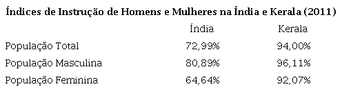 Considera-se, atualmente, que os incentivos que favoreceram a empregabilidade em K erala foram importantes fatores que possibilitaram, ao menos, às mulheres oriundas das baixas castas terem acesso à educação, usufruindo, nesse aspecto, da qualidade da educação superior britânica introduzida na Índia no século XIX. Embora se reconheça que apenas alguns grupos se beneficiaram desse padrão de educação, o maior impacto dessa política foi o de permitir que tanto meninos quanto meninas tivessem acesso a ela ( PAZICH, 2015, p. 150). Isso, inegavelmente, foi reflexo do sistema de reserva desenvolvido com a finalidade de compensar as desigualdades historicamente conformadas pelo sistema de castas e profundamente consolidado na sociedade indiana, ressalvou Pazich (2015, p. 142-143), que, ainda nesse contexto, apresentou referência positiva acerca dos dados apurados pelo Office of the R egistrar General & Census Commissioner, no ano de 2011, segundo o qual houve signiticativas melhoras quanto ao nível de instrução de homens e mulhes, comparativamente, entre a população indiana e a do Estado de Kerala ( PAZICH, 2015, p. 147):