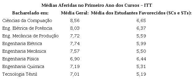 Uma referência ilustrativa dessa realidade foi obtida com estudo detalhado de dados, no ano de 2008, sobre diversos cursos de graduação mantidos pelo India n Institute of Technology (IIT) em Dehli. De acordo com Verónica e Kala, os dados avaliativos das médias de aproveitamento de estudantes pertencentes às minorias favorecidas (SCs e STs) com as cotas e as médias gerais, que compreendem todos os estudantes (favorecidos e não favorecidos), revelaram a defasagem dos primeiros ( ROBLES; KRISHNA, 2012, p. 4):