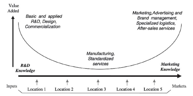 However, the countries that are hosts to these FDIs do not necessarily acquire the same value in the GVCs, in fact, they usually are the ones that profit the less in the whole process, which can be explained by the concept of the “smile curve” (see Figure 1): the concept of the smile curve was first used in 1992 by Stan Shih, the founder of Acer, “[he] observed that in the personal computer industry, both ends of the value chain command higher values added to the product than the middle part of the value chain” ( YE; MENG; WEI, 2015, p. 2-3).