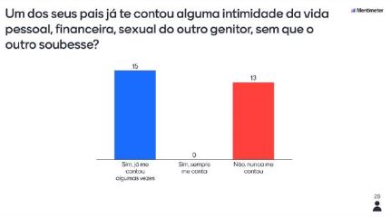 Mais da metade dos participantes também reportaram ter sido depositários das intimidades conjugais dos seus genitores, recebendo confidências escondido do outro par, em número superior ao número de participantes cujos pais já se separaram/divorciando, mostrando, mais uma vez, a prática disseminada desse ato ainda na constância da relação conjugal.