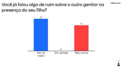 A maioria dos participantes reportou a vivência da experiência de ouvir um dos genitores falando mal do outro em quantitativo que demonstra que essa é realidade inclusive quando os pais ainda estão em união conjugal. Na categoria “falar mal”, inclui-se a previsão da Lei da Alienação Parental brasileira (nº 12.318/2010) de realizar campanha de desqualificação da conduta do genitor no exercício da paternidade ou maternidade (artigo 2º, parágrafo único, inciso I).