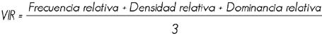 Los valores relativos de frecuencia, densidad y dominancia se combinaron en el Valor de Importancia Relativa (VIR), con base en la fórmula definida por Müeller-Dombois y Ellenberg (1974):