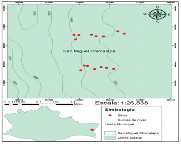 La investigación se desarrolló en la localidad de San Antonio, perteneciente a la zona oriente del municipio San Miguel Chimalapa, Juchitán, Oaxaca, entre las coordenadas 16°39’27.56” N y 94°11’34.74” O, a una altitud media de 1075 m. El clima es AC(w2)(w) (semicálido subhúmedo), con humedad relativa alta, lluvias de verano con precipitación media anual de 576 a 3 300 mm y temperatura media anual de 20 °C (Rodríguez, 2014).
