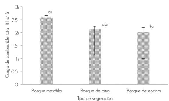 Rodríguez (2014) determinó las cargas de combustibles en San Miguel Chimalapa; sus resultados tienen similitud a los obtenidos en el presente estudio para el compartimento herbácea y arbusto, a excepción de la hojarasca que es superior en el bosque mesófilo y en el bosque de pino (Cuadros 3 y 4).