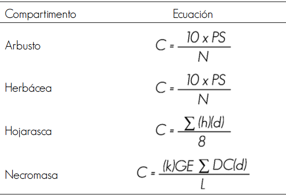 Para cuantificar la biomasa en los compartimentos arbusto, hojarasca, herbácea y necromasa fue necesario calcular el factor de conversión (FC) que resulta de la división del peso seco y el peso verde de las muestras. Con el producto del peso fresco del material vegetal en el sitio y el FC se estimó la biomasa de cada uno de los compartimentos.