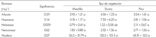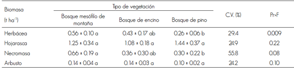 Los tipos de vegetación evaluados mostraron diferencias significativas (p < 0.009) en la biomasa del compartimento herbáceo, el cual fue significativamente (Duncan, 0.05) superior en el bosque de pino (2.11 ± 0.67 t ha-1), que en el bosque mesófilo de montaña (0.79 ± 0.41 t ha-1). Los mayores contenidos de biomasa en madera se concentraron en el bosque de encino (135.5 t ha-1), mientras que lo contrario ocurrió (43.31 t ha-1) en el bosque de pino. En virtud de la alta variabilidad en la madera, no fue posible detectar diferencias significativas mediante la comparación de medias de Duncan (Cuadro 2).