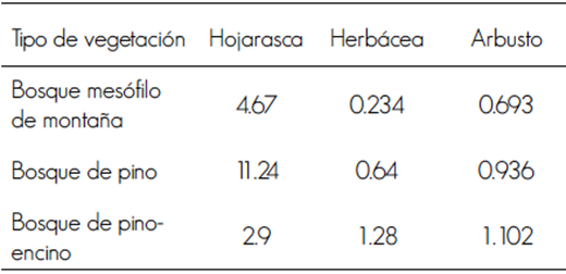 Rojas y Villers (2008) establecieron 2.09 t ha-1 de biomasa total para el bosque de encino, valores que son similares a los calculados en el trabajo que se documenta (Figura 3). Las normas internacionales consideran de 20 a 30 t ha-1 de alto riesgo, de 15 a 20 t ha-1 de riesgo medio y menos de 15 t ha-1 de riesgo bajo (Porrero, 2001). Por ello, el intervalo de 2.008 a 2.59 t ha-1 determinado en este estudio, el más alto de cuyas cifras se verifica en el bosque mesófilo de montaña, sugiere que el riesgo de incendios es bajo.