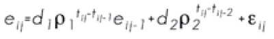 Para corregir la autocorrelación del término del error las ecuaciones fueron ajustadas con mínimos cuadrados ponderados, con el uso de una estructura autorregresiva continua de los errores (CAR2), a partir de la distancia entre las mediciones de altura para cada árbol (Zimmerman y Núñez, 2001; Vargas et al., 2013). El modelo autorregresivo presentó la forma siguiente: