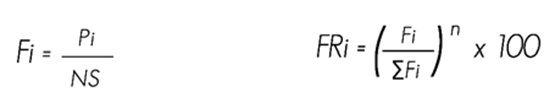 Fi = Frecuencia relativa FRi = Frecuencia relativa de la especie i respecto a la frecuencia total Pi = Número de sitios en los que está presente la especie i NS = Número total de unidades de muestreo