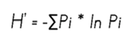 H’ = Índice de Shannon-Wiener Pi = Proporción de individuos de la especie i Ln = Logaritmo naturalLa equitatividad o proporción que guardan las abundancias relativas de las especies de la comunidad se determinó mediante el índice de Equitatividad de Shannon-Wiener (E ) de acuerdo con Magurran, 2004.