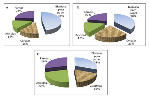 Rodríguez (1994) documenta que la utilización del bosque y su industrialización propicia la acumulación de altos volúmenes de desechos fibrosos, particularmente corteza, durante el proceso de obtención de celulosa; señala que la corteza se caracteriza por contener extraíbles, sobre todo taninos que son materia prima de muy bajo costo para generar fenoles y compuestos que pueden usarse como absorbentes de metales pesados y para la formación de proteínas. En este sentido, se planteó como primer objetivo hacer un balance de la biomasa desechada de cada especie de pino (ramas corteza y acículas). El segundo fue la determinación de los compuestos químicos en la madera, el análisis micrográfico y las propiedades de resistencia fisicomecánica del papel, para identificar, con base en estos resultados, cuál de las tres especies presenta las mejores características dasométricas, de biomasa aprovechable, de fracciones químicas, características morfológicas y fisicomecánicas para proponer su viabilidad de aprovechamiento integral.