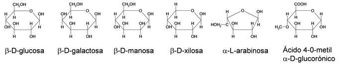 La fracción de carbohidratos, holocelulosa (68 a 90 %), está compuesta por celulosa y hemicelulosa, a su vez integradas por hexosanos y pentosanos (Ávila y Herrera, 2012). Químicamente, la celulosa es un polisacárido con estructura lineal, constituida por moléculas de glucosa (β-d-glucopiranosa unidas mediante enlaces β-1,4), con fórmula empírica C6H10O5 (Sjöstrom, 1993); y los carbohidratos de bajo peso molecular (Figura 5) son polisacáridos compuestos por más de un tipo de monómero unidos por enlaces β (1-4) que forman una cadena lineal ramificada junto con la celulosa y, a su vez, forman parte de la red de microfibrillas que configuran la pared celular de los tejidos (Rowell, 2005).