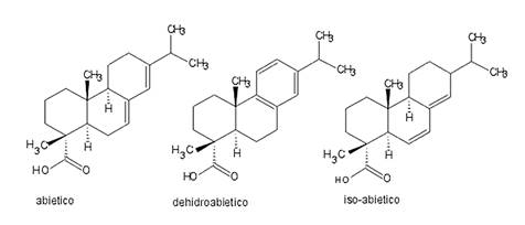 La fracción de extraíbles en los pinos se compone de ácidos resínicos (60 - 75 %), ácidos grasos (15 - 20 %) y una fracción volátil o trementina (5 - 10 %). Los ácidos resínicos (80 %) son compuestos de fórmula general, C20H3002, que se clasifican de acuerdo con su estructura en dos series: abietano, con un sistema de doble enlace y un grupo isopropílico (sustituyente en el tercer anillo); y pimarano que tienen un grupo vinílico y uno metilo en la misma posición (Figura 7).