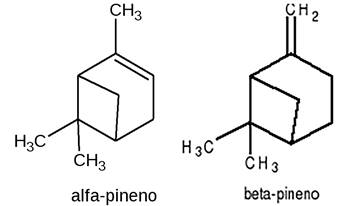 Goldstein (2017) señala que el aceite de trementina y la colofonia son los principales productos de este tipo de ácidos resínicos. La fracción de ácidos grasos presentes en los extractos de pinos está compuesta por ácidos formados por 18 átomos de carbono (C18), de ellos predominan el oleico y el linoléico, y en menor proporción el palmítico y el esteárico. Finalmente, la fracción volátil conformada, básicamente, por trementina, aguarrás o aceite de pino (subproducto en el proceso de fabricación del papel), se obtiene al separar por destilación los vapores ligeros de la fracción de ácidos resínicos que está integrada por una mezcla de terpenos con fórmula general, C10H16, entre los que destacan el alfa y beta pineno (Figura 8).