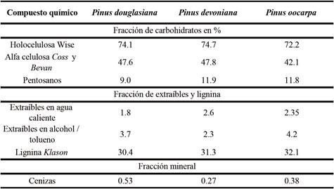 Respecto a la composición química de las diferentes fracciones de biomasa aprovechable para papel (madera) de las tres especies de pino, se observa (Cuadro 2 y Figura 12) que el porcentaje de holocelulosa fue superior en Pinus devoniana, con 74.7 % y en Pinus douglasiana, con 74.1 %.). Bernabé-Santiago et al. (2013) registran contenidos de holocelulosa en Pinus oocarpa (74.15 %), P. teocote Schiede ex Schltdl. et Cham. (71.54 %), P. michoacana (72.96 %), P. leiophylla Schiede ex Schltdl. et Cham. (69.16 %) y P. montezumae Lamb. (68.14 %), valores muy parecidos a los documentados en el presente trabajo, y dentro del intervalo (68 - 78 %) citado por Fengel y Wegener (1989) para diferentes pinos. Sin embargo, Boonstra (2006) consigna contenidos de 79 a 81 % para P. radiata D.Don y P. sylvestris L., superiores a los obtenidos en este estudio; dichos autores señalan que utilizaron el método Rowell, el cual difiere del método Wise, utilizado en la investigación que aquí se documenta.