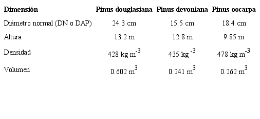 En el Cuadro 1 se observa que la medición dasométrica en las tres especies de pino indica que Pinus douglasiana tiene el mejor desarrollo, ya que presentó la mayor altura (13.2 m), DAP (24.3 cm) y volumen (0.602 m3) con respecto a los especímenes de los otros dos taxa. Pinus oocarpa, aunque con más densidad (478 kg m-3) y DAP (18.4 cm) que Pinus devoniana, registró la menor altura (9.85 m).