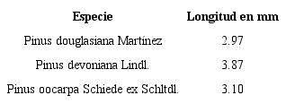 En la medición de fibras, mediante el análisis micrográfico (Cuadro 3), las de P. devoniana fueron las más largas (3.87 mm), con respecto a las de P. douglasiana (2.97 mm) y P. oocarpa (3.10 mm). Borja et al. (2001) midieron la longitud de fibra en P. caribea Morelet registraron un valor de 4.41 mm, superior a los del presente estudio; sin embargo, esto es normal, debido a que la variación de crecimiento se establece de acuerdo con la especie, tratamiento, así como de las condiciones climatológicas y topográficas.