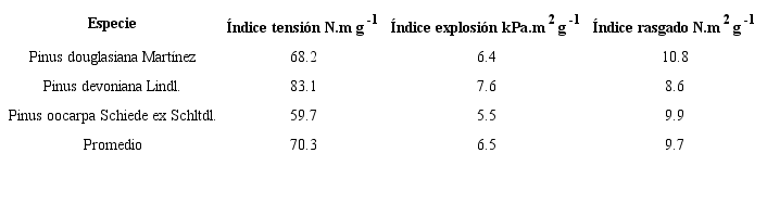 El análisis micrográfico y la determinación de propiedades fisicomecánicas en papel estándar, registran que las fibras de Pinus devoniana son las más largas (3.87 mm) y también le corresponden los mejores índices de resistencia fisicomecánica en tensión (83.1 N.m g-1) y explosión (7.6 kPa. m2 g-1).