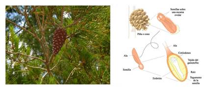 Entre las características de los pinos, que pertenecen a las coníferas de madera blanda, resinosa y no porosa, se pueden citar: plantas leñosas (Figura 2) que se reproducen por medio de semillas ubicadas entre las escamas de los conos femeninos (Perry, 1991). Las acículas, por lo regular tienen valor taxonómico; por ejemplo, existen pinos que presentan de 2 a 3 acículas, los cuales son árboles productores de madera sólida resinosa, con corteza que se resquebraja o se levanta en escamas, conos erectos de escamas engrosadas y semillas con ala articulada; en tanto que las especies de cinco acículas, agrupan a individuos productores de madera menos sólida, poco resinosa, piñas un tanto péndulas de escamas poco engrosadas en su ápice y con un ombligo marginal (Martínez, 1992).