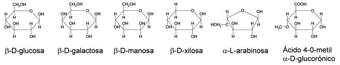 La fracción de carbohidratos, holocelulosa (68 a 90 %), está compuesta por celulosa y hemicelulosa, a su vez integradas por hexosanos y pentosanos (Ávila y Herrera, 2012). Químicamente, la celulosa es un polisacárido con estructura lineal, constituida por moléculas de glucosa (β-d-glucopiranosa unidas mediante enlaces β-1,4), con fórmula empírica C6H10O5 (Sjöstrom, 1993); y los carbohidratos de bajo peso molecular (Figura 5) son polisacáridos compuestos por más de un tipo de monómero unidos por enlaces β (1-4) que forman una cadena lineal ramificada junto con la celulosa y, a su vez, forman parte de la red de microfibrillas que configuran la pared celular de los tejidos (Rowell, 2005).