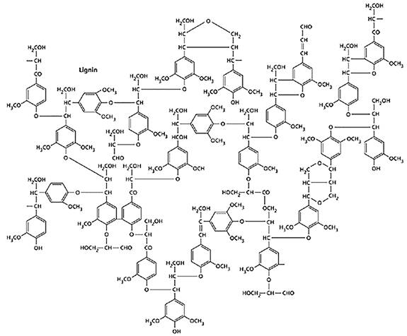 Después de los polisacáridos, la lignina es el polímero orgánico más abundante en el mundo vegetal (15 a 35 %), en la madera cumple múltiples funciones, entre ellas la de actuar como un cemento interfibrilar, que además de pegar y unir, proporciona rigidez a la pared celular y resistencia a los tejidos, impidiendo el ataque de microorganismos y la penetración de enzimas destructivas (Rowell, 2005). Los polímeros de la lignina son estructuras transconectadas con un peso molecular de 10 000 unidades atómicas; son la unión de varios ácidos y alcoholes fenilpropílicos que forman diversas estructuras poliméricas (Figura 6). Por esta razón, no es posible definir una estructura de la lignina; sin embargo se han propuesto diversos modelos que la representan (Sjöstrom, 1993).