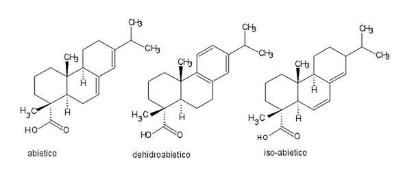 La fracción de extraíbles en los pinos se compone de ácidos resínicos (60 - 75 %), ácidos grasos (15 - 20 %) y una fracción volátil o trementina (5 - 10 %). Los ácidos resínicos (80 %) son compuestos de fórmula general, C20H3002, que se clasifican de acuerdo con su estructura en dos series: abietano, con un sistema de doble enlace y un grupo isopropílico (sustituyente en el tercer anillo); y pimarano que tienen un grupo vinílico y uno metilo en la misma posición (Figura 7).