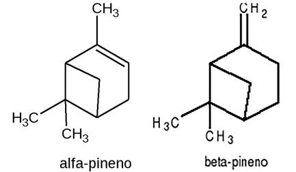 Goldstein (2017) señala que el aceite de trementina y la colofonia son los principales productos de este tipo de ácidos resínicos. La fracción de ácidos grasos presentes en los extractos de pinos está compuesta por ácidos formados por 18 átomos de carbono (C18), de ellos predominan el oleico y el linoléico, y en menor proporción el palmítico y el esteárico. Finalmente, la fracción volátil conformada, básicamente, por trementina, aguarrás o aceite de pino (subproducto en el proceso de fabricación del papel), se obtiene al separar por destilación los vapores ligeros de la fracción de ácidos resínicos que está integrada por una mezcla de terpenos con fórmula general, C10H16, entre los que destacan el alfa y beta pineno (Figura 8).
