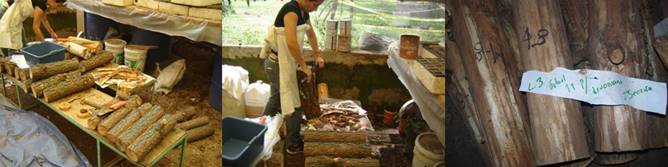 Los troncos fueron seccionados con motosierra, se midieron y se secaron por dos semanas antes de descortezarlos manualmente; una vez secos y sin corteza se pesaron y midieron (Figura 10). Las ramas y acículas, o follaje, también se pesaron para establecer un balance de material aprovechable de toda la biomasa (fuste, ramas, corteza y acículas) por especie de pino.